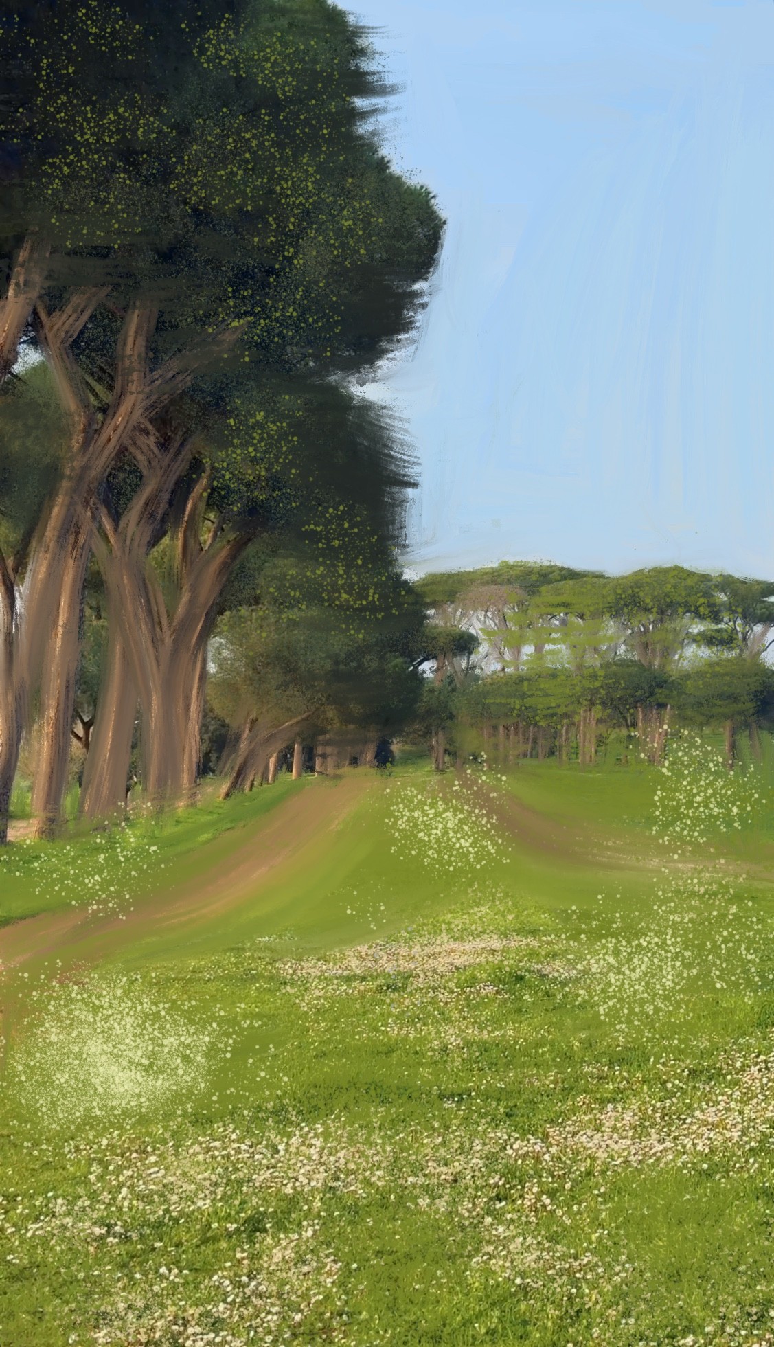 - Tuscany garden morning cypress umbrella pine wildflowers — gestural oil painting print by Noemi Fleming VivRo