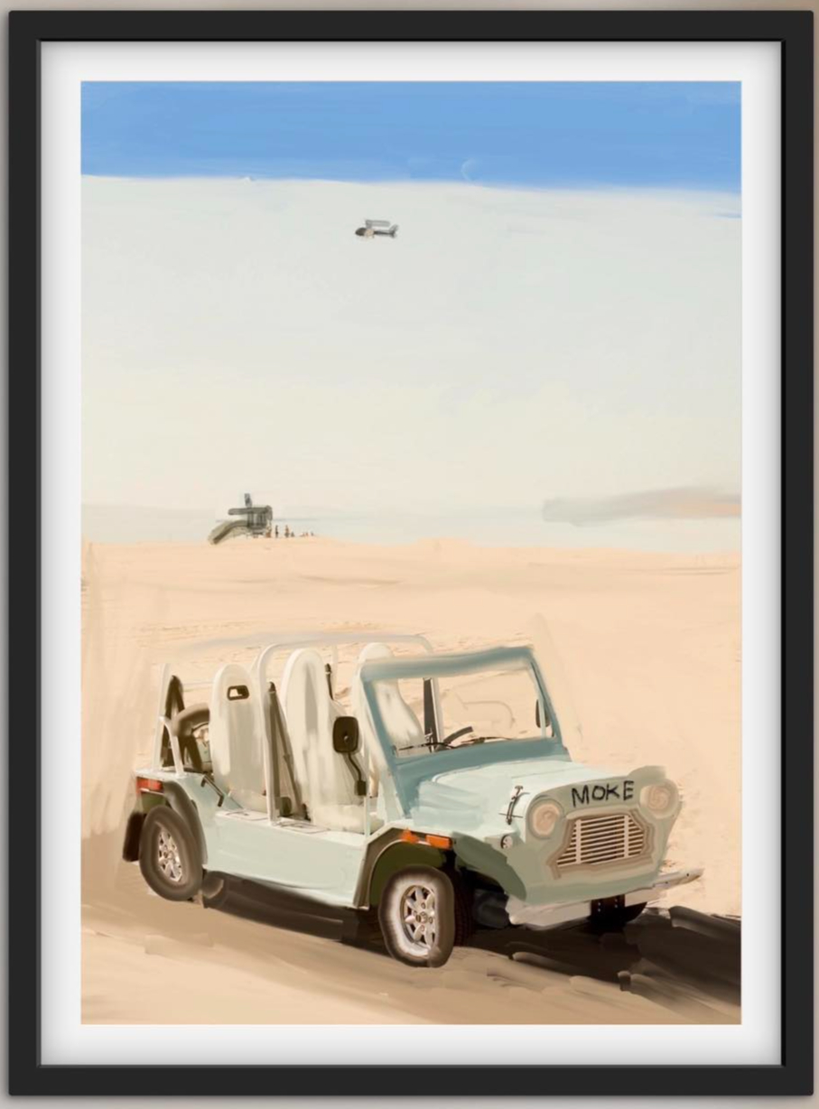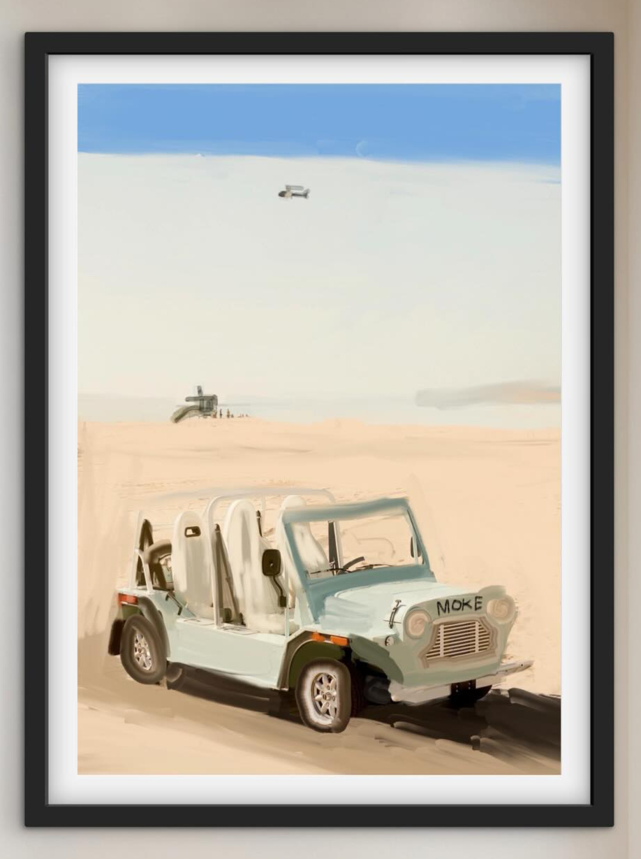 - Mint green Moke beach car California — coastal oil painting print by Noemi Fleming VivRo