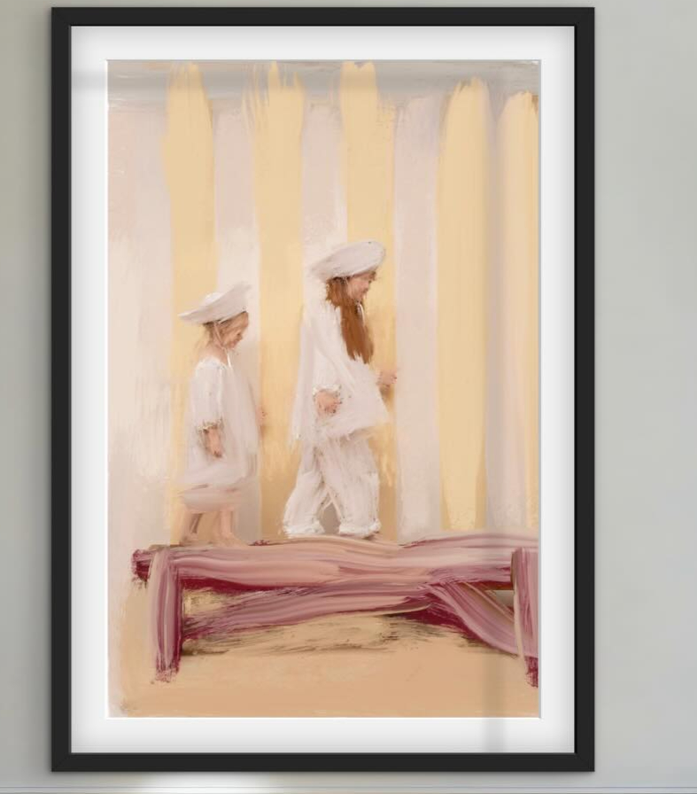 Two impeccably dressed little girls walk the gilded corridors of the Ritz — tender, elegant and quietly magical. Signed fine art print by Noemi Rochelle Fleming. Ships worldwide.