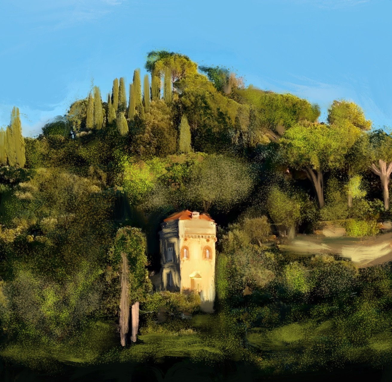 Tuscany medieval tower golden villa hidden forest cypress trees cerulean sky — Italian landscape oil painting print by Noemi Rochelle Fleming VivRo