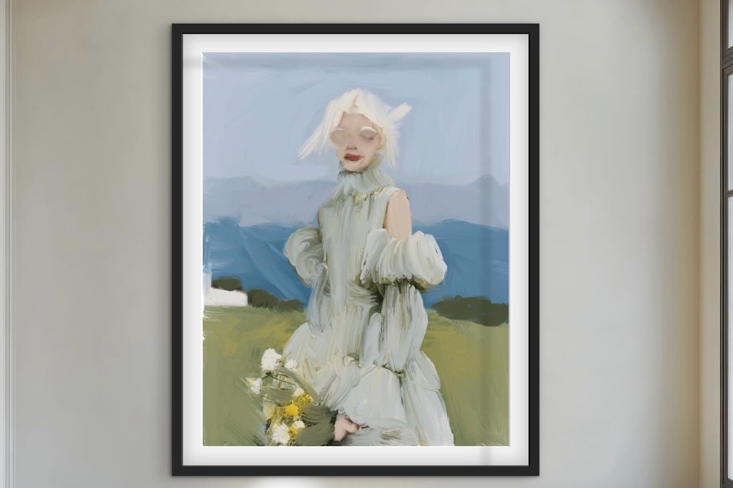 An ethereal figure in a white puffed-sleeve dress stands in an open landscape with wildflowers — quiet, monumental, unforgettable. Signed print by Noemi Fleming. Ships worldwide