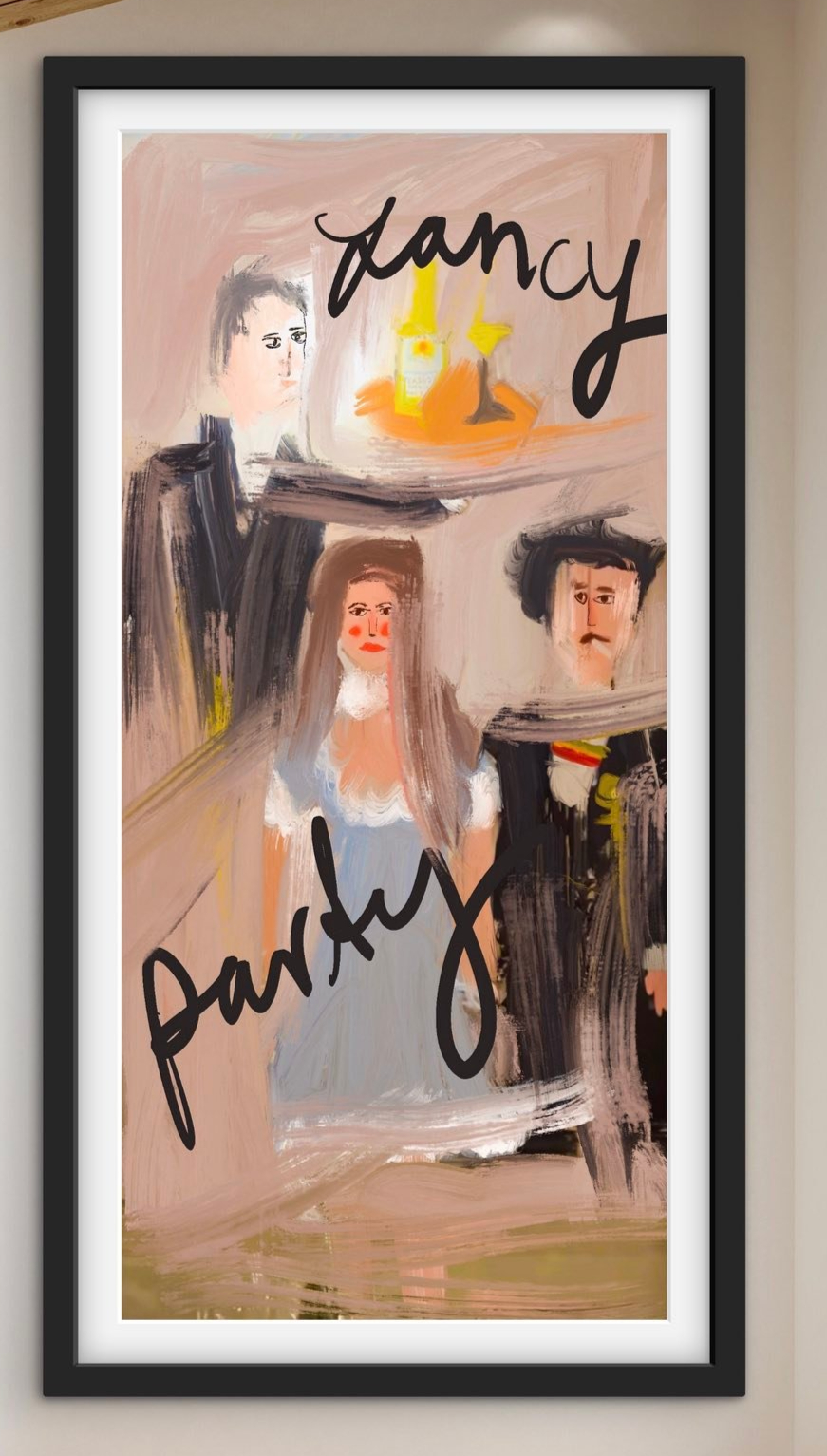 - Fancy party social scene figures champagne hand-lettered text — expressive oil painting print by Noemi Fleming VivRo