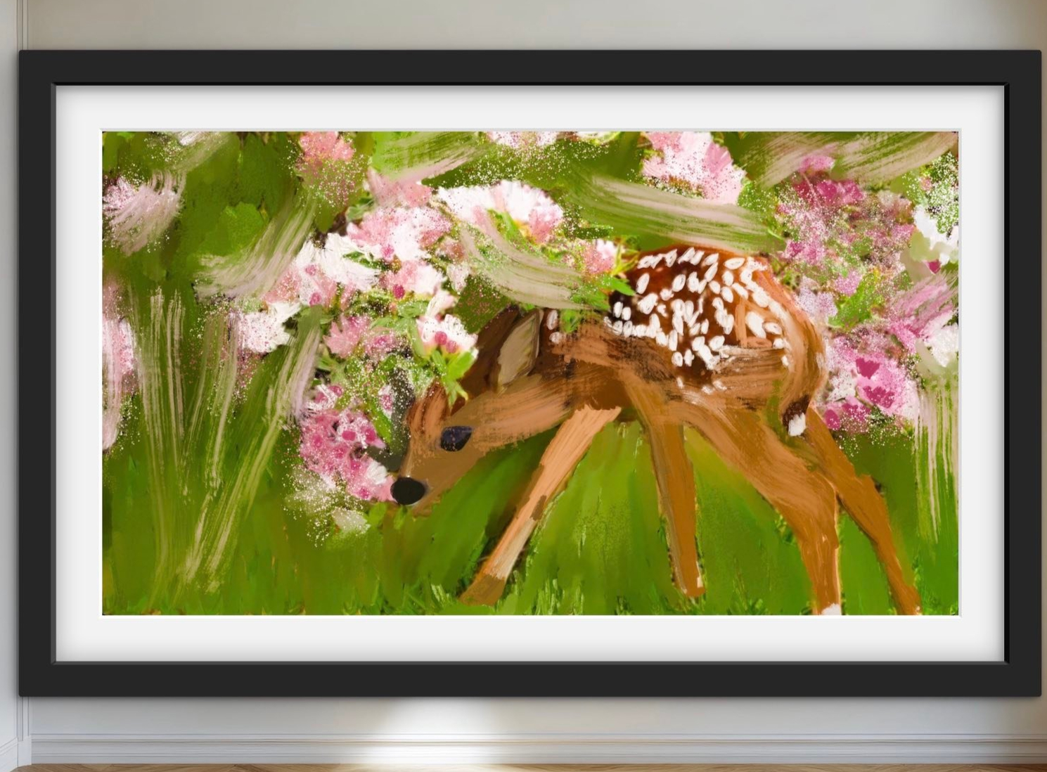 - Baby fawn spotted deer pink blossom garden — expressive oil painting print by Noemi Fleming VivRo