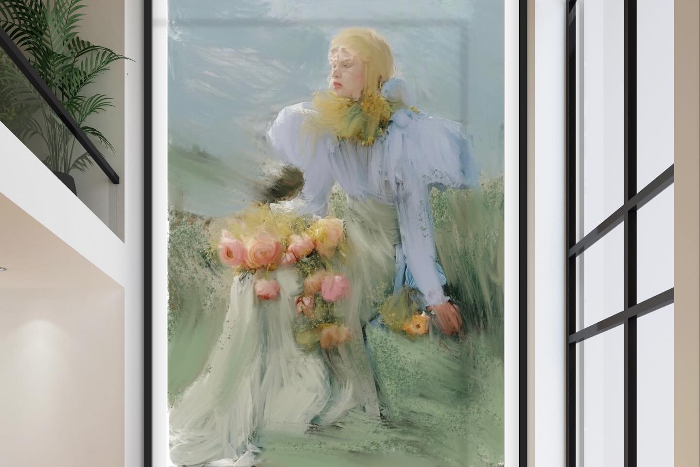 - Woman figure carrying roses blush peach blue dress soft atmospheric — oil painting print by Noemi Fleming VivRo