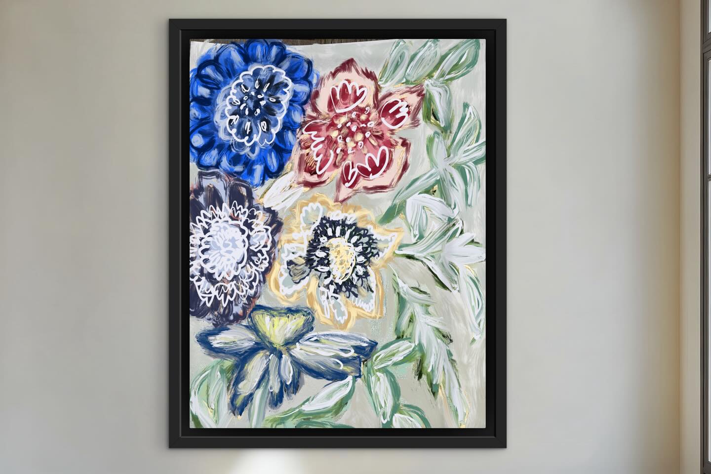 Four bold botanical blooms in cobalt, burgundy, navy and cream on sage — expressive, decorative and deeply beautiful. Signed fine art print by Noemi Fleming. Ships worldwide