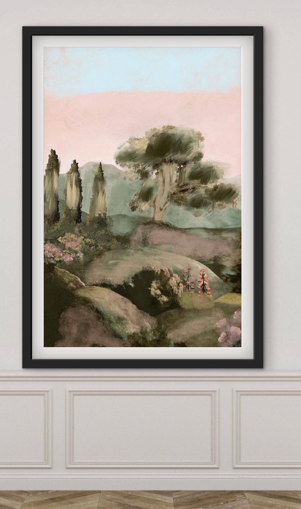 - Tuscan landscape cypress trees rolling hills blush pink sky wildflowers — gestural oil painting print by Noemi Rochelle Fleming VivRo