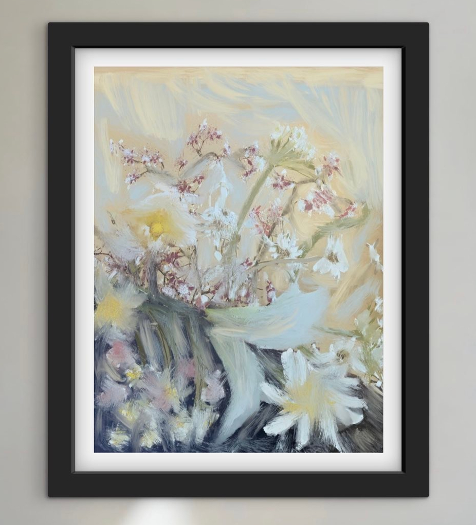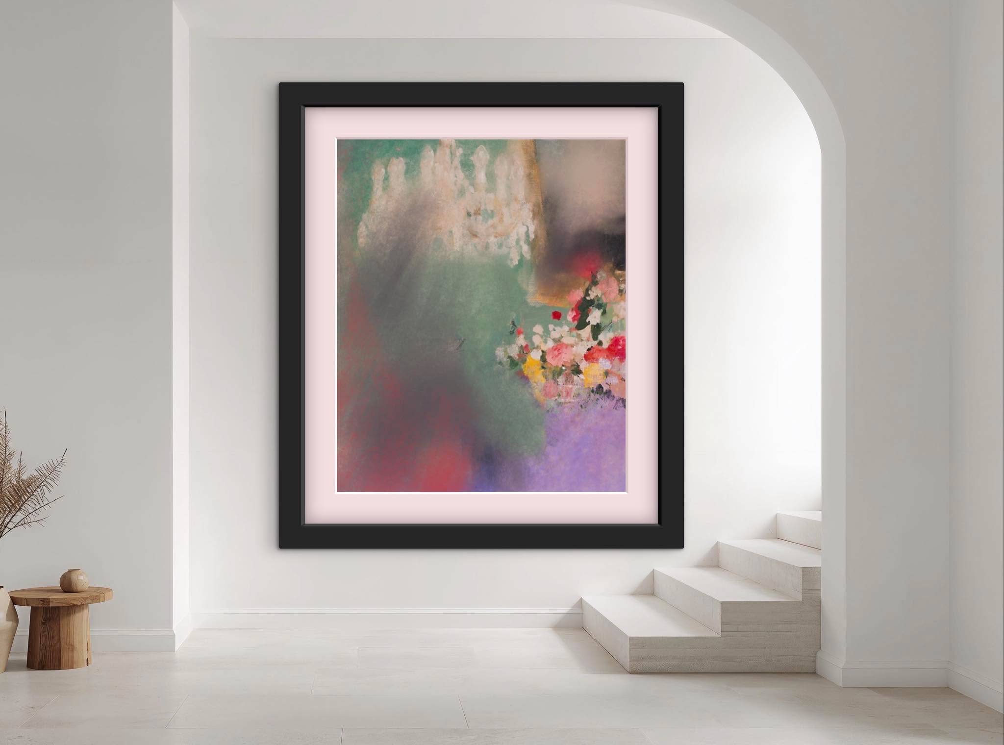A magnificent crystal chandelier fades behind an exuberant bouquet of peonies and wildflowers — sage, dusty rose and lavender in dreamy oils. Signed fine art print by Noemi Fleming. Ships worldwide.