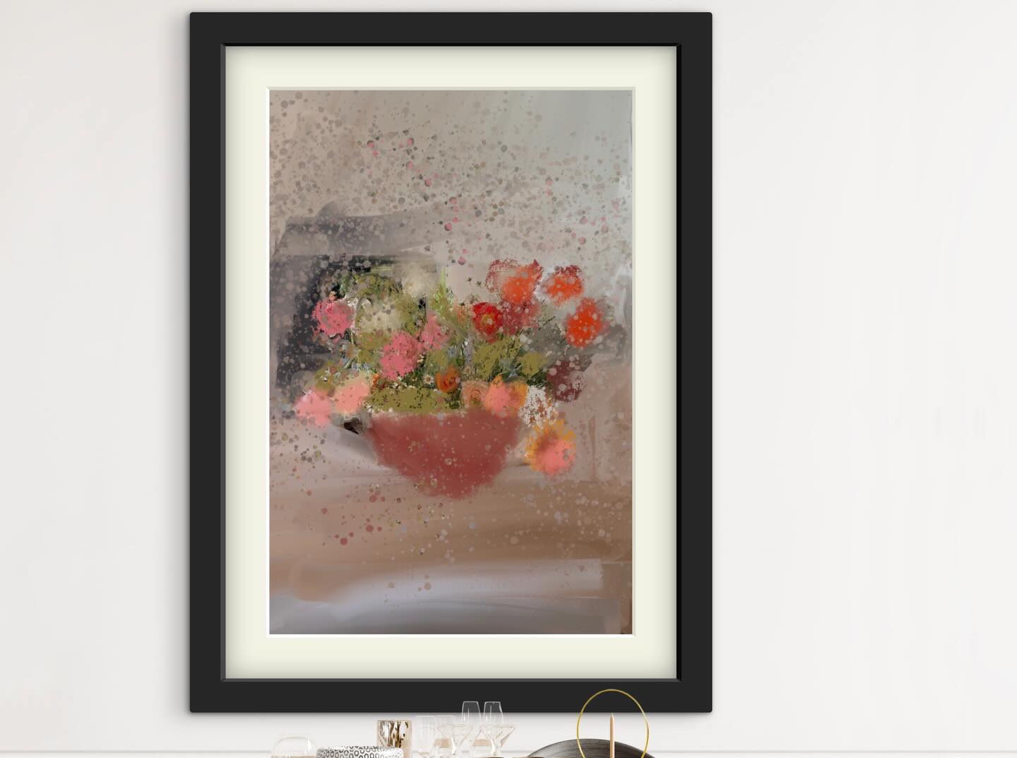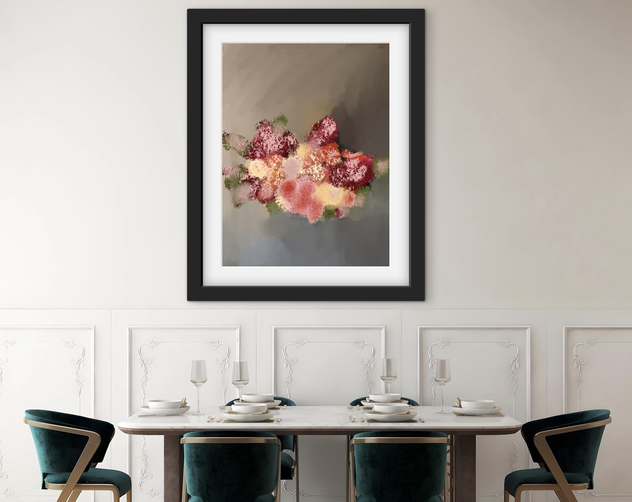 - Vivro art by Noemi F print of abstract flowers above a dining table