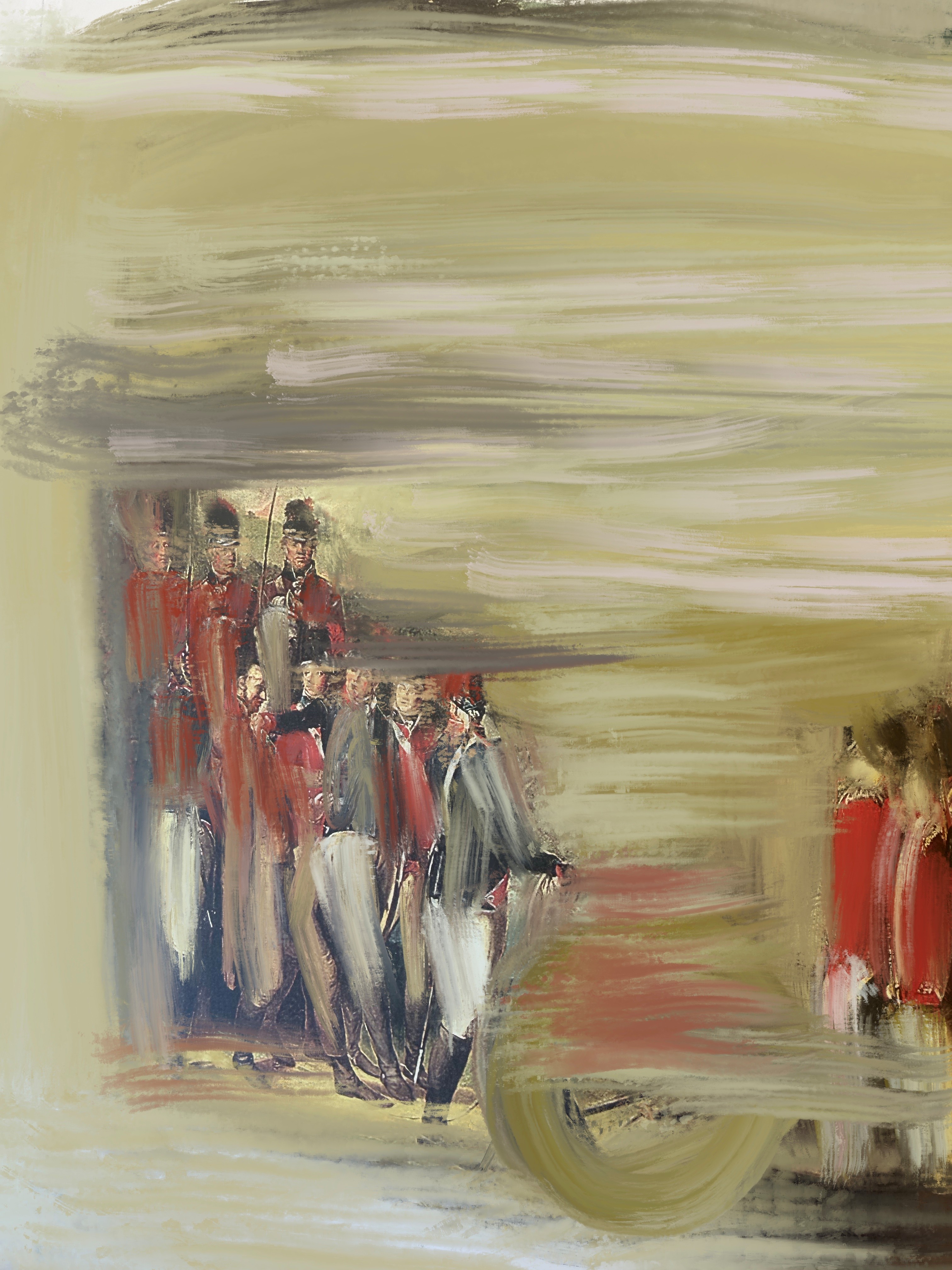 Napoleonic soldiers red coats marching regiment Old Master reimagined thick oil brushwork — painting print by Noemi Fleming VivRo