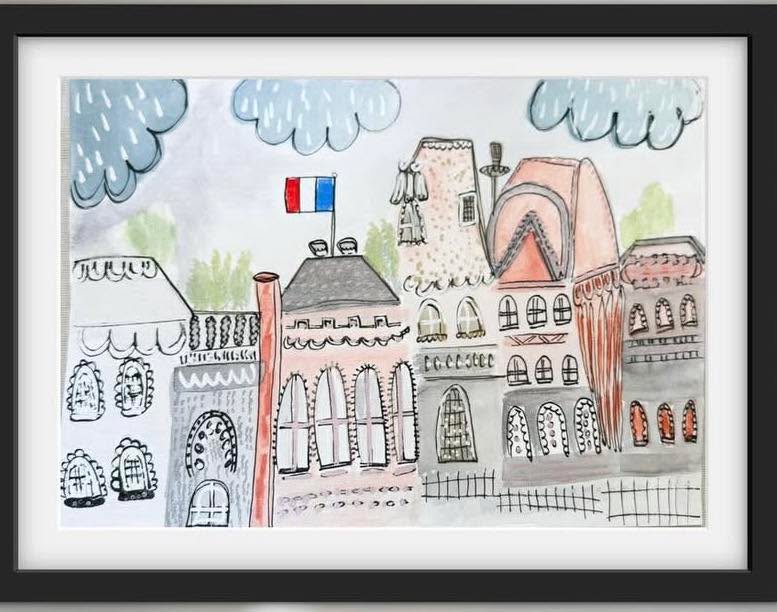 - Bonjour Paris whimsical child illustration French flag rooftops — art print by Noemi Fleming VivRo
