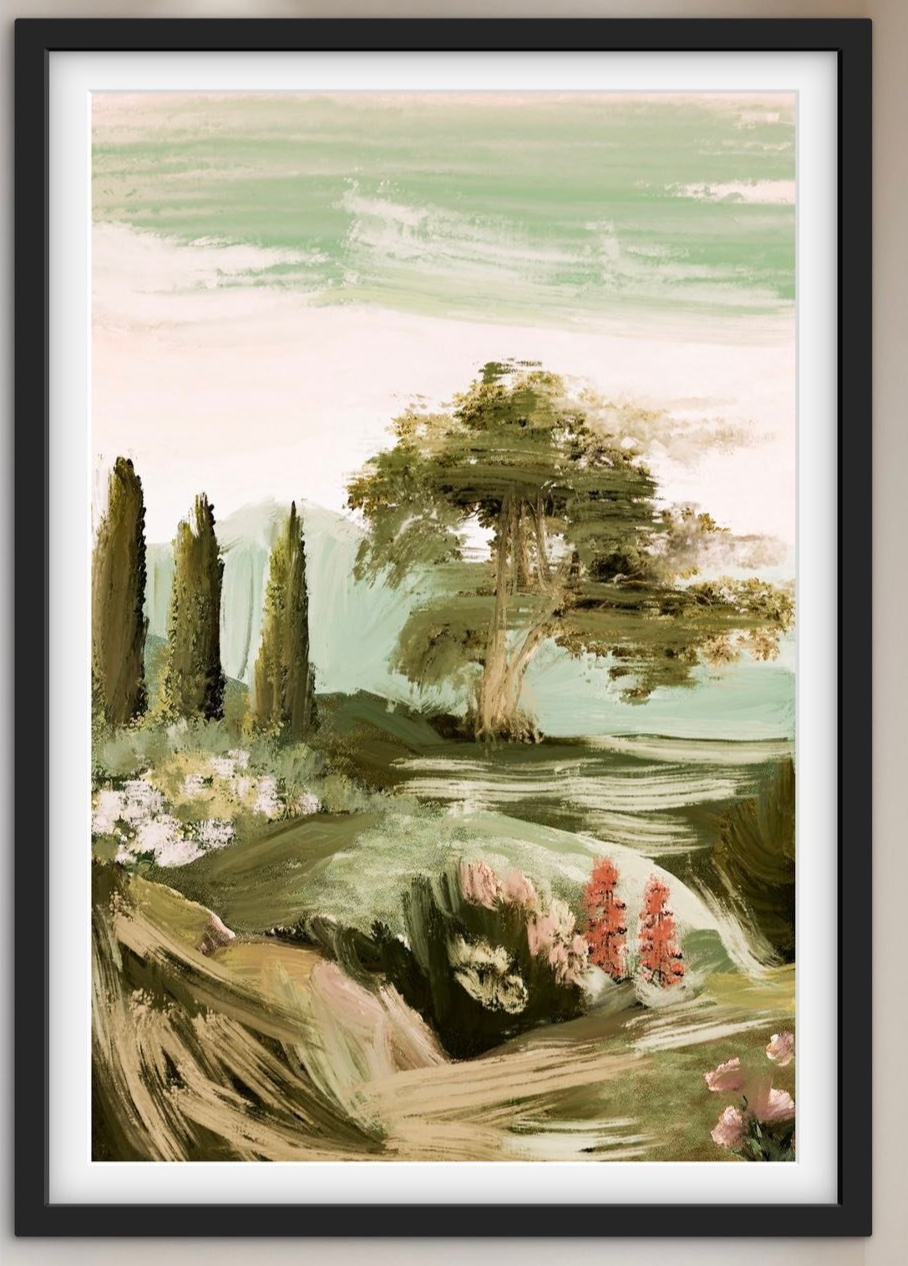 - Tuscany landscape painting, Italian hills art, cypress tree art, romantic landscape print, dreamy art print