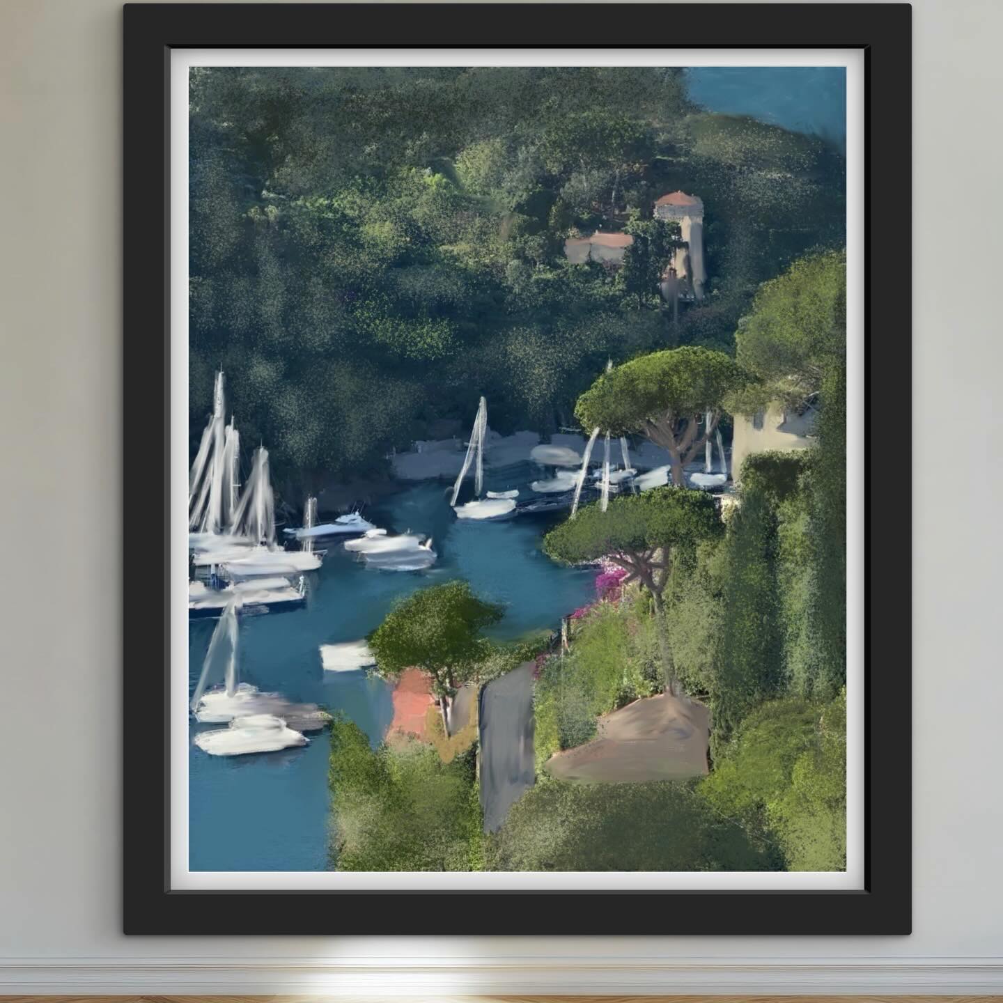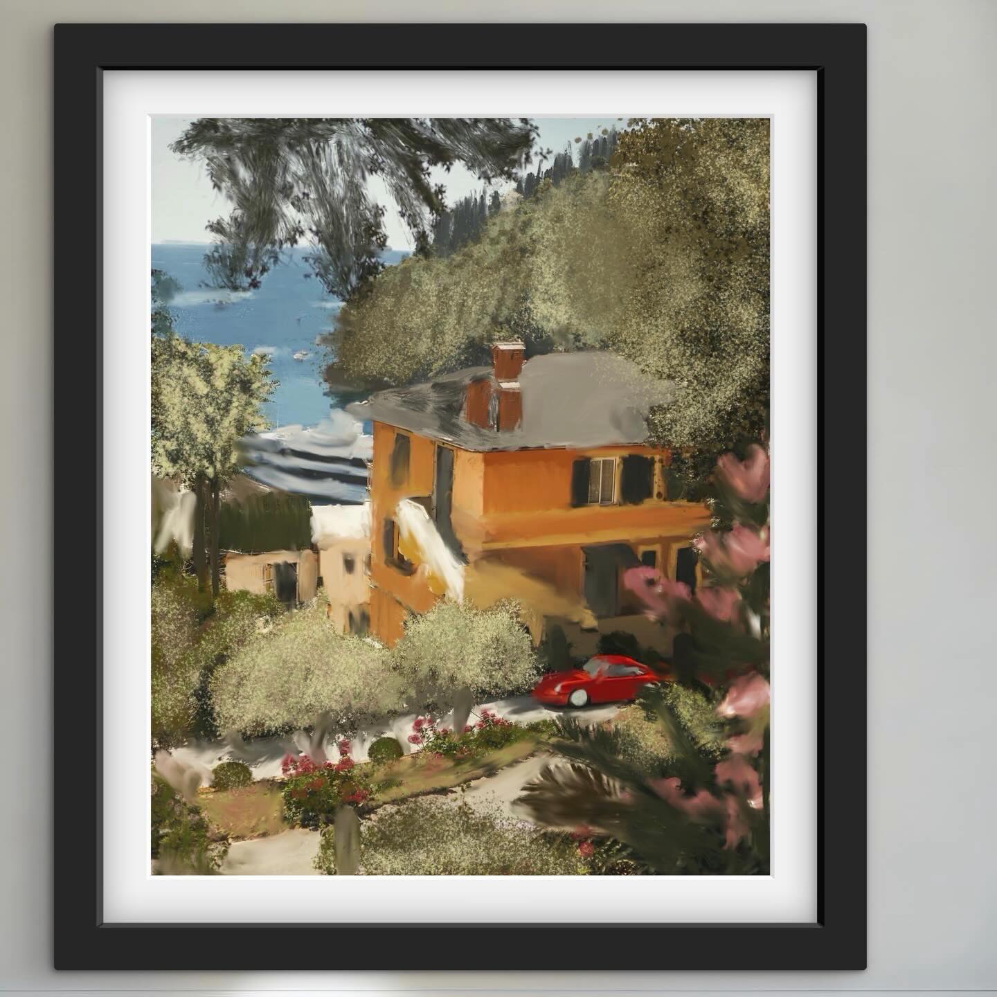 - Portofino orange villa vintage red car Italian hillside bougainvillea garden — oil painting print by Noemi Rochelle Fleming VivRo