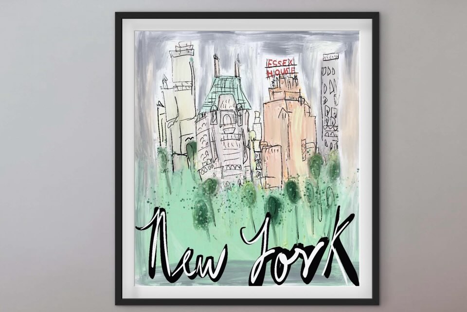 - New York City skyline Central Park Essex House hand lettered — expressive painting print by Noemi Fleming VivRo
