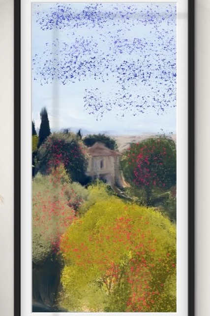 - Murmuration starlings Tuscany villa garden bloom coral yellow — landscape oil painting print by Noemi Fleming VivRo