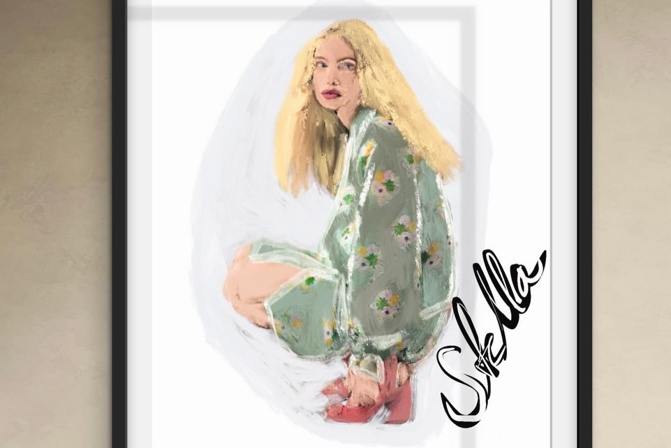 Stella — a luminous portrait of a young woman in sage floral robe and red shoes, hand-lettered name in bold script. Signed art print by Noemi Fleming. Perfect personalised gift