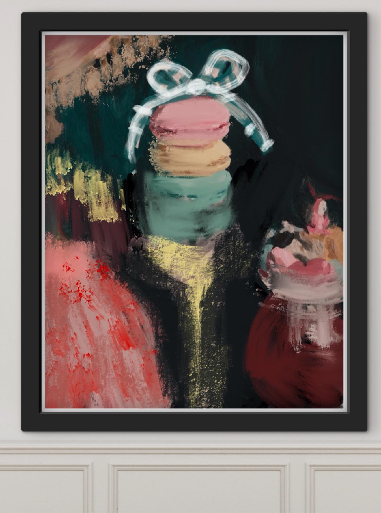 - white rabbit cake hat portrait interior reverie hot pink abstract — oil painting print by Noemi Fleming VivRo