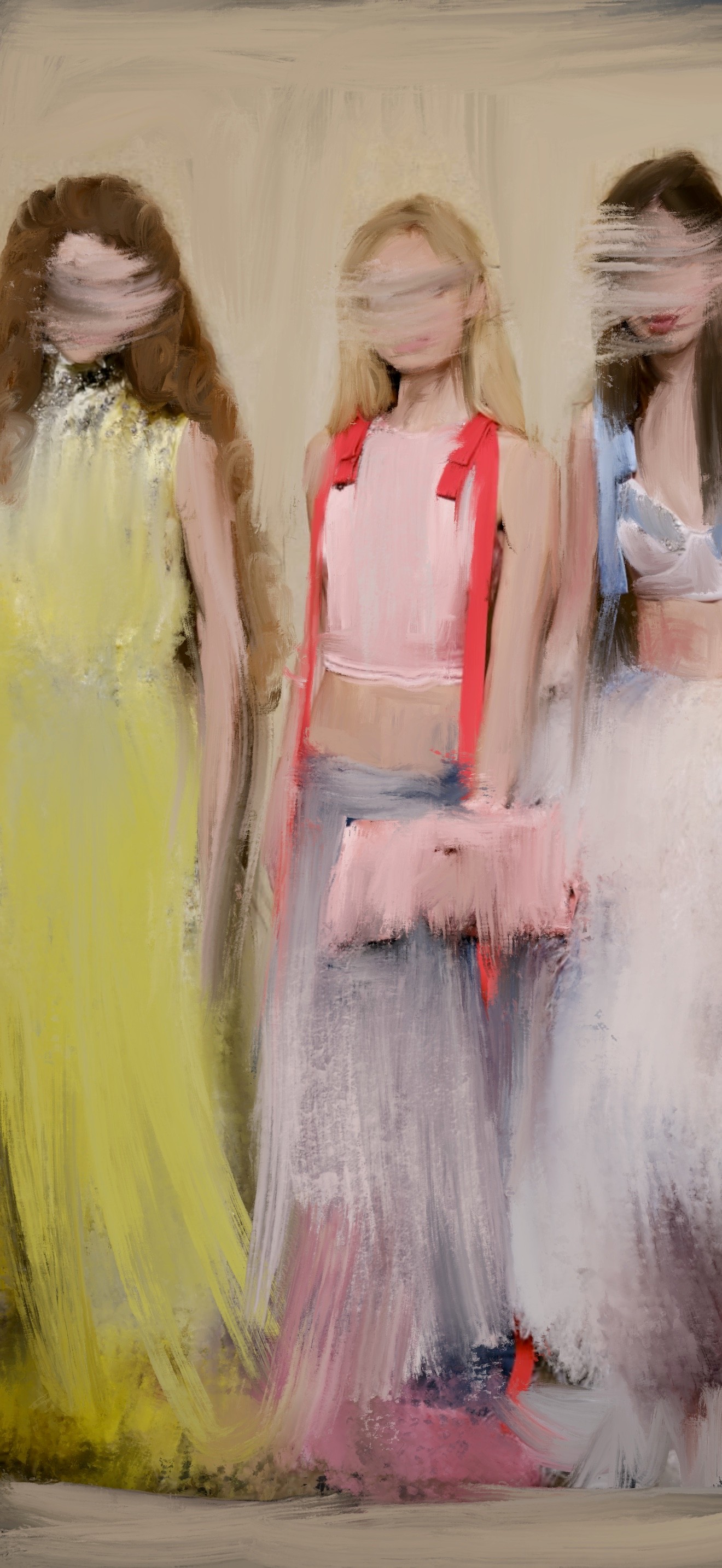 Three fashion runway models faceless figures yellow pink blue gowns expressive oil painting print by Noemi Fleming VivR