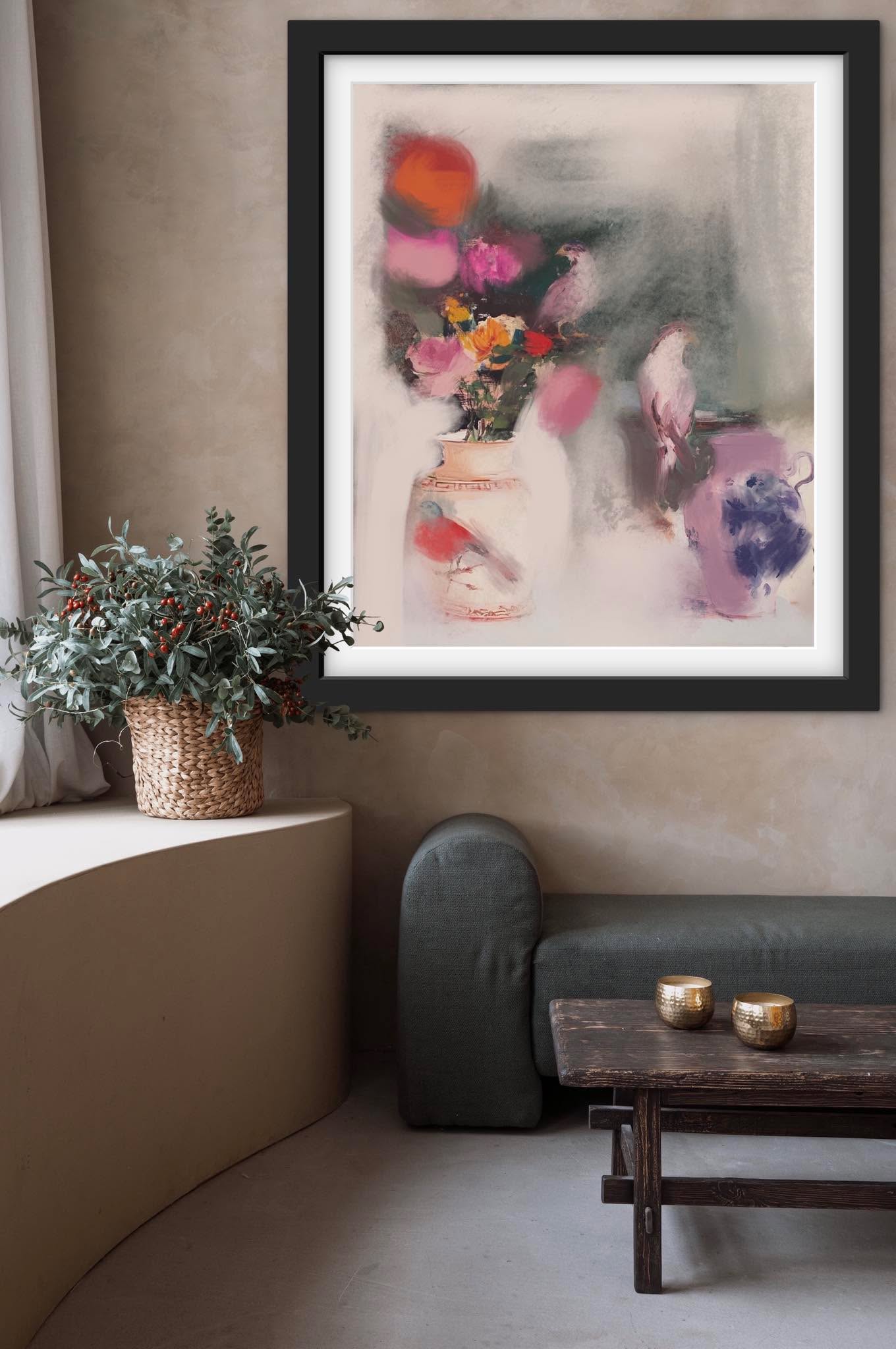 - Crystal chandelier overshadowed by blowsy floral bouquet sage green dusty rose lavender interior — oil painting print by Noemi Rochelle Fleming VivRo