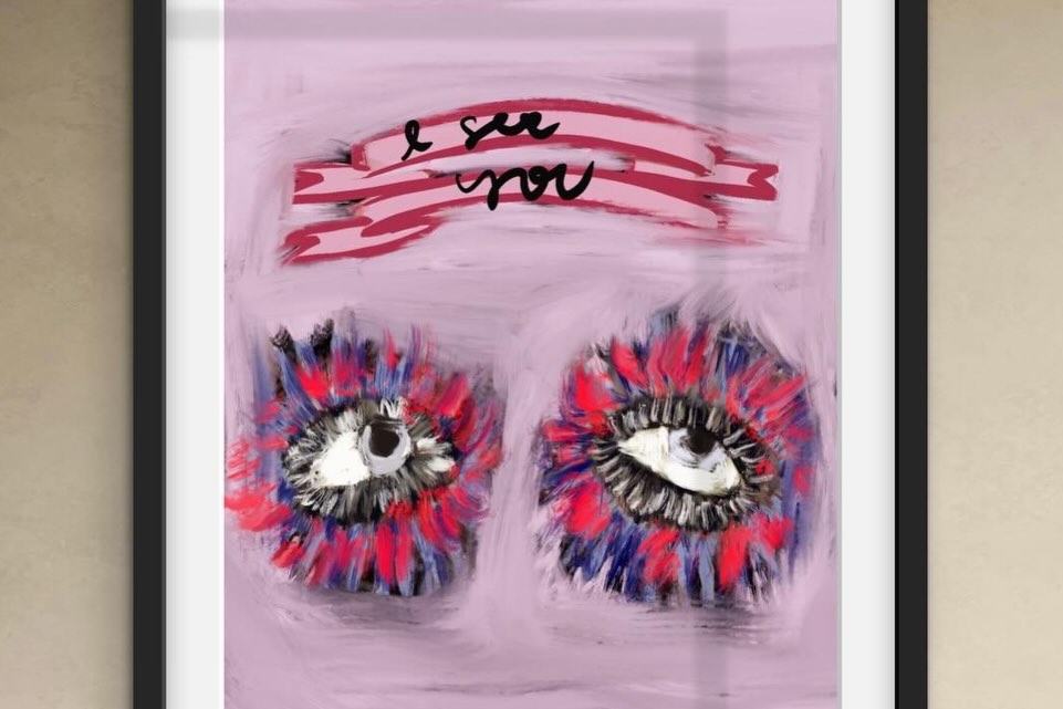 Two wild expressive eyes and a hand-lettered 'I see you' — bold, confrontational, and surprisingly tender. Signed abstract art print by Noemi Fleming. Ships worldwide.