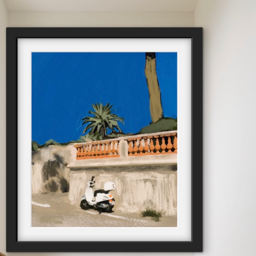 - White Vespa parked Mediterranean wall palm tree terracotta — Italian street scene oil painting print by Noemi Fleming VivRo