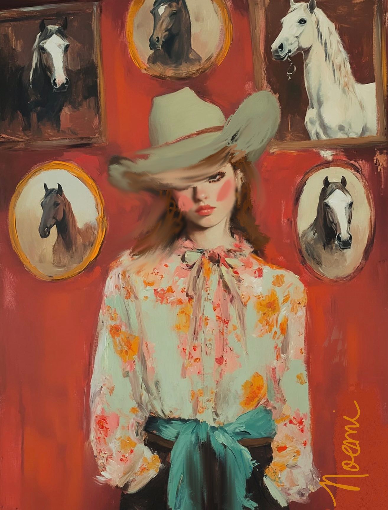 - Cowgirl self portrait Stetson red background — oil painting print by Noemi Rochelle Fleming VivRo